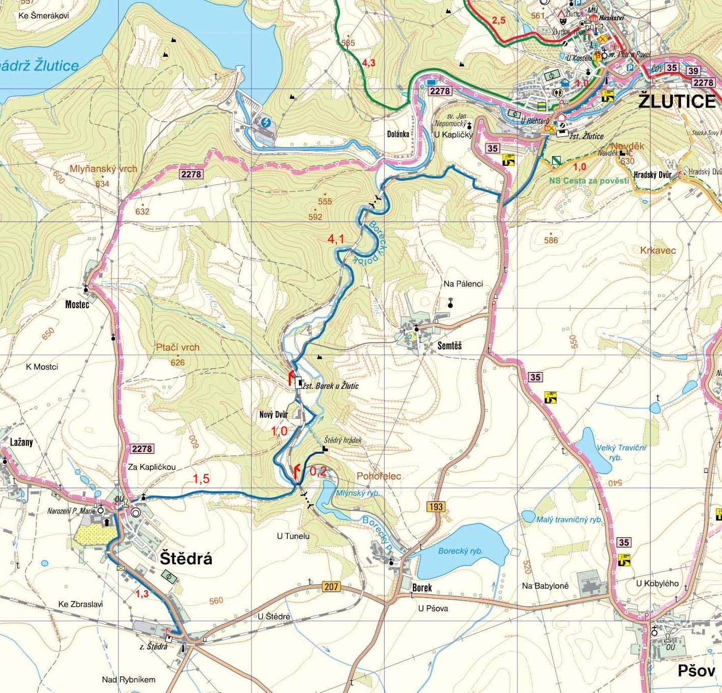 Stezka vede z náměstí ve Žluticích k nádraží Štědrá — v polovině trasy je zastávka Borek u Žlutic, lze využít i autobusovou dopravu. Trasa míjí kapličku Panny Marie ve svahu kopce Bellhübel, sestupuje do údolí k Boreckému potoku a vede kolem původního Semtěšského mlýna a zemědělské usedlosti Nový dvůr až k Boreckému mlýnu.