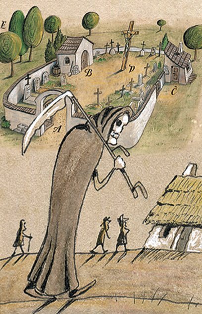 Tabule nejen poučí o tradicích kolem pohřbívání, ale i pobaví díky naprosto originálnímu zpracování popisu katolického pohřbu — rukopis nezaměnitelného žlutického výtvarníka.